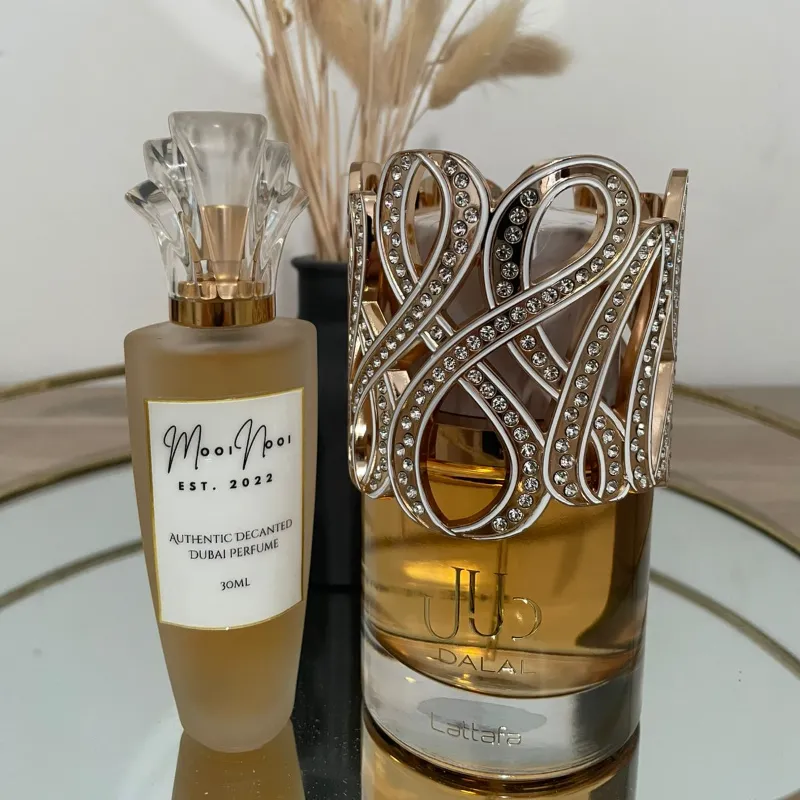Lattafa Dalal is a warm, sweet gourmand fragrance with a soft fruity touch and a cozy, comforting character. It opens with a gentle burst of orange and fruity notes, giving a light, slightly tangy sweetness. The heart introduces a smooth blend of caramel and floral nuances, adding a rich, dessert-like warmth while keeping the scent balanced. As it settles, the base becomes creamy and inviting, with vanilla, sandalwood, and musk creating a soft, long-lasting and slightly powdery trail.